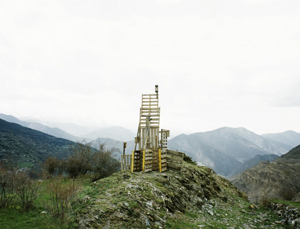 “Antas pursues the notion of manipulating the landscape through his new body of work, which was produced during a residency in the Catalan Pyrenees. He has created structures for birds to live in, placing these fragile bird boxes en masse amongst the harsh landscape or standing alone on a mountain top. What we view is the image; the image after this act, the image devoid of action. We are left to view the bird boxes standing in the landscape, in a solitary environment devoid of any other sign of life. The photographs take on a melancholic quality: empty, perched on cliff tops reaching into the sky, the structures attempt majesty but fail in their fragility. The lack of inhabitants and the poetic stillness of the images emphasise the gap between the surroundings and ourselves, representing man´s failed attempt to converge with the landscape.1